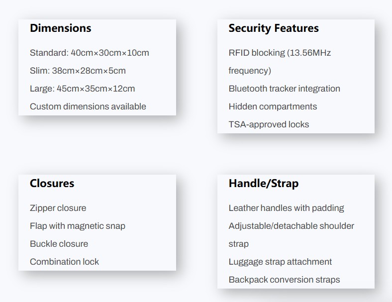 Enhance your leather briefcase with practical features such as a USB charging port, headphone jack, anti-theft hidden pockets, and expandable side compartments to meet the needs of modern professionals. Chest and waist straps can also be added for ergonomic support, making long-term carrying more comfortable.